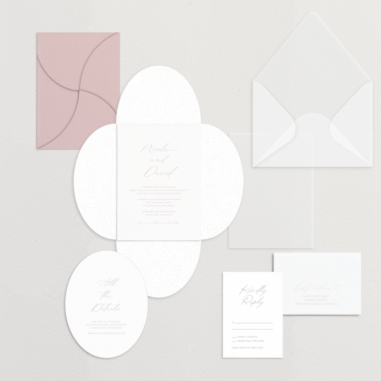The Lucca Collection brings in our very own vine mosaic pattern into a gorgeous petal fold around the main invitation. Inspired by the weaving hills outside of Lucca, this suite is all about refined romance.