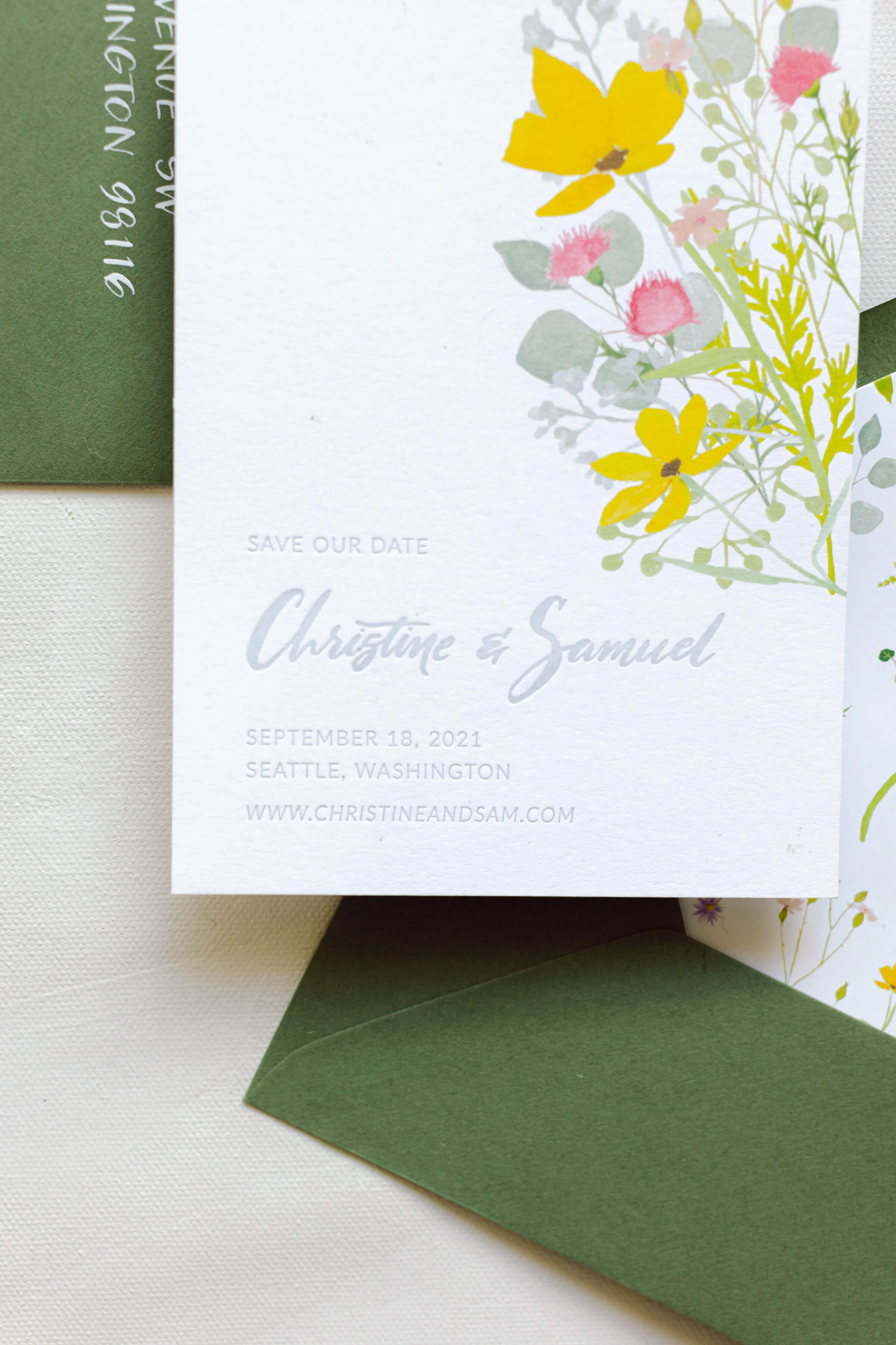 The pricing for The Rainier Collection includes custom spot-calligraphy for your names. As an added upgrade, Rachel can calligraph guest addresses on your outer (or inner) envelopes in the ink color of your choice.